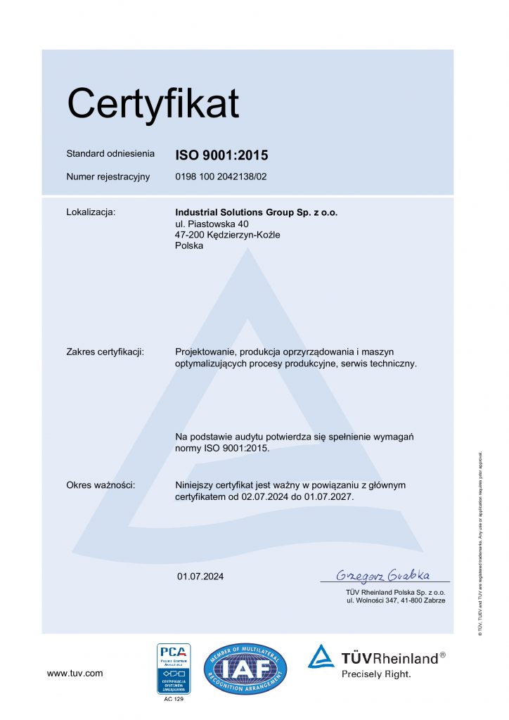 Od dnia 2.07.2021 jesteśmy posiadaczami certyfikatu ISO 9001:2015. Jego otrzymanie potwierdza zgodność naszych usług z międzynarodową normą określającą wymagania w zakresie zarządzania jakością.
